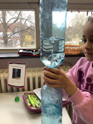 Auch das Thema Wasser bot jede Menge Staun-Momente: Die Kinder untersuchten, warum manche Dinge schwimmen und andere sinken, und erforschten Oberflächenspannung und Wirbelbildung in der Flasche.