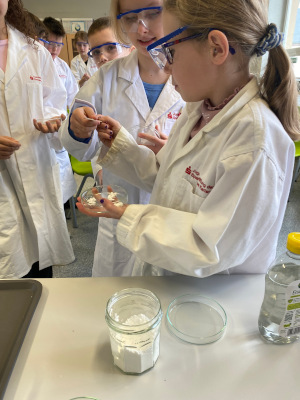 Im Forscherlabor drehte sich bei den vierten Klassen alles um Chemische Reaktionen. Mit viel Neugier untersuchten die Kinder Stoffeigenschaften, testeten den pH-Wert mithilfe von Rotkohlsaft und ließen einen selbstgebauten Backpulver-Vulkan ausbrechen.