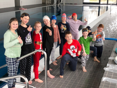 Eine gemischte Gruppe aus Dritt- und Viertklässlern absolvierte parallel eine Erste-Hilfe-Ausbildung. Auf dem Programm standen unter anderem das Anlegen von Verbänden, die stabile Seitenlage sowie die Grundlagen der Herzdruckmassage. Höhepunkt war eine Notfallübung im Schwimmbad.