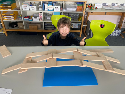 Das zweite große Thema war Brückenbau. Nach einer Einführung in verschiedene Brückentypen bauten die Kinder eigene Konstruktionen und erlebten dabei, wie selbst kleinste Veränderungen die Tragfähigkeit beeinflussen konnten. Anschließend setzten sie ihr Wissen über Stabilität und Konstruktion praktisch um und erprobten unterschiedliche Brückenarten – von der einfachen Balkenbrücke bis hin zur ausgeklügelten Leonardo-da-Vinci-Brücke.