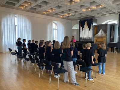 Nach dem Einsingen in einem beeindruckenden Turmzimmer des Schlosses war es soweit und unser Chor betrat die Bühne. Unsere Akteure sangen die Lieder: „Sing mit uns“, “So viele Wunder“, „Alle für einen“ und „Alles muss klein beginnen“ mit viel Freude und Können.